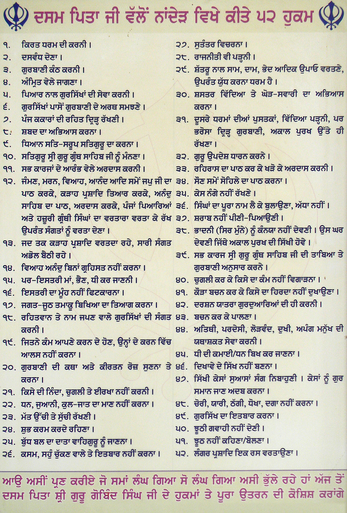 | 7 | Panj Kakaar di Rehat drirh kar rukhni | ਪੰਜ ਕਕਾਰ ਦੀ ਰਹਿਤ ਦ੍ਰਿੜ੍ਹ ਕਰ ਰੱਖਣੀ | Follow the discipline of the 5 K’s strictly. |
